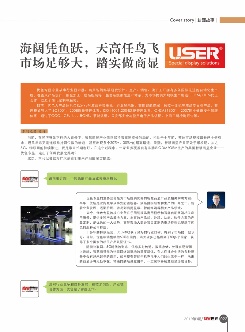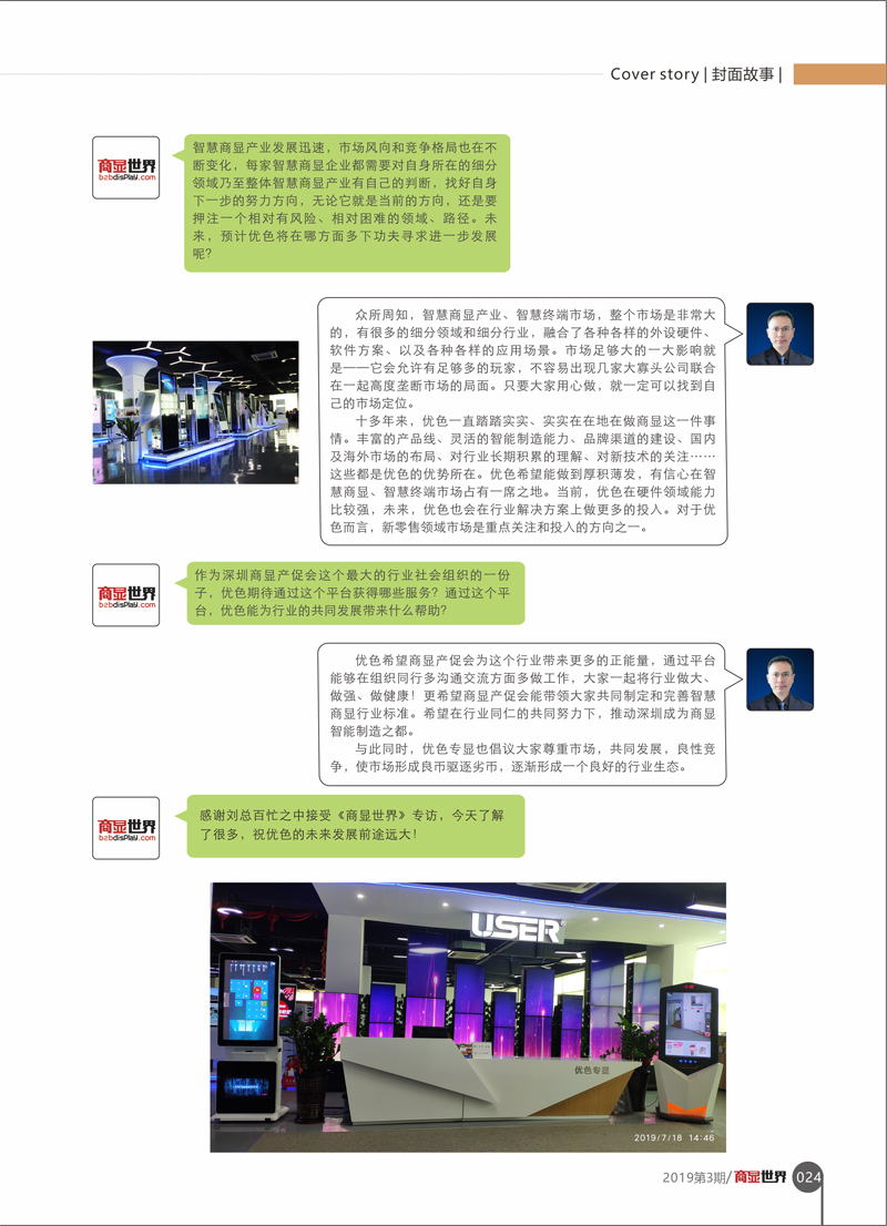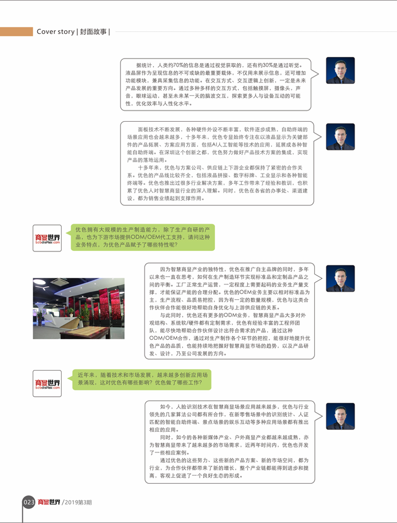 近日優色專顯接受商顯世界專訪,在此次采訪中優色總經理劉峰認真分析未來智慧商顯行業發展趨勢,講述優色專顯自身的產品及業務布局概況,隨著高速5G和萬物互聯時代的到來,信息實時傳遞,數據存儲、智能云端,智慧商顯作為物聯網終端的重要載體,在人類生活的各種場景中會得到廣泛應用。 優色專顯本次專訪刊登在商顯世界2019年第03期,以下是專訪的詳細內容與大家一起分享: