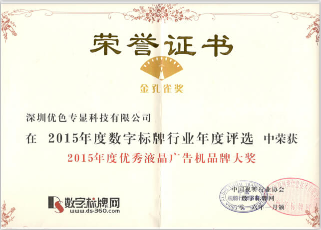 深圳優(yōu)色專顯科技有限公司榮獲 “2015年度優(yōu)秀液晶廣告機品牌大獎”