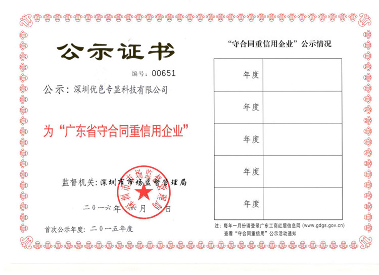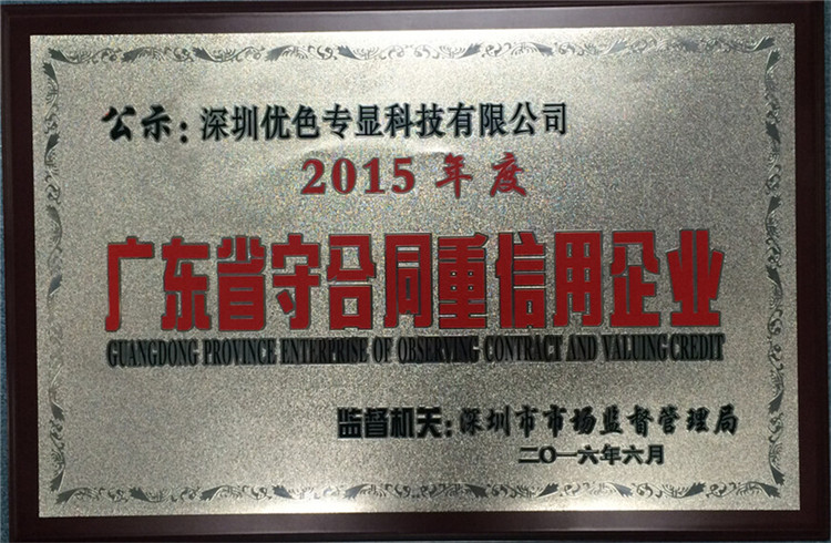 近日,廣東省工商行政管理局公示了2015年度省內“守合同重信用”企業(yè),深圳優(yōu)色專顯科技有限公司首次上榜,獲此殊榮,意味著社會各界對優(yōu)色專顯在誠信經營、企業(yè)信用體系建設、維護合同信用等方面給予的充分肯定和高度評價。