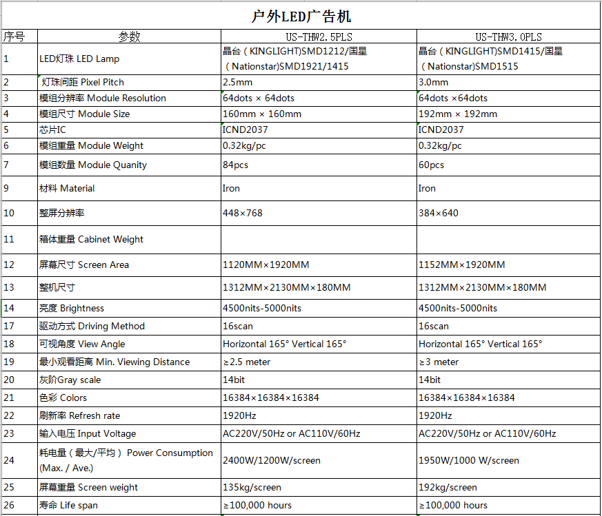 單屏LED戶外廣告機參數: